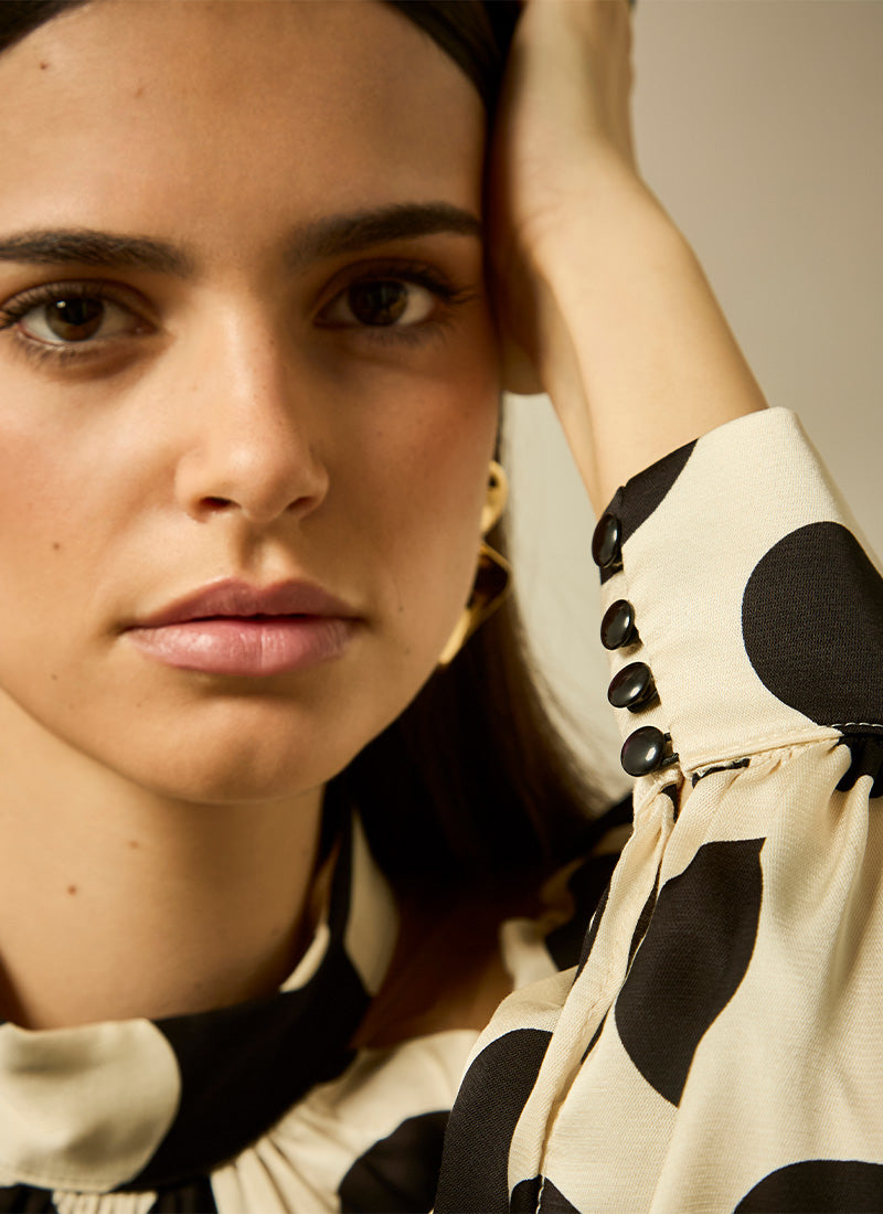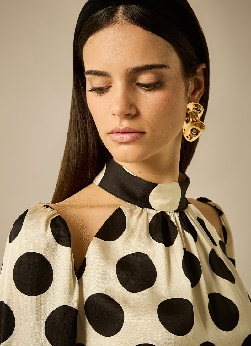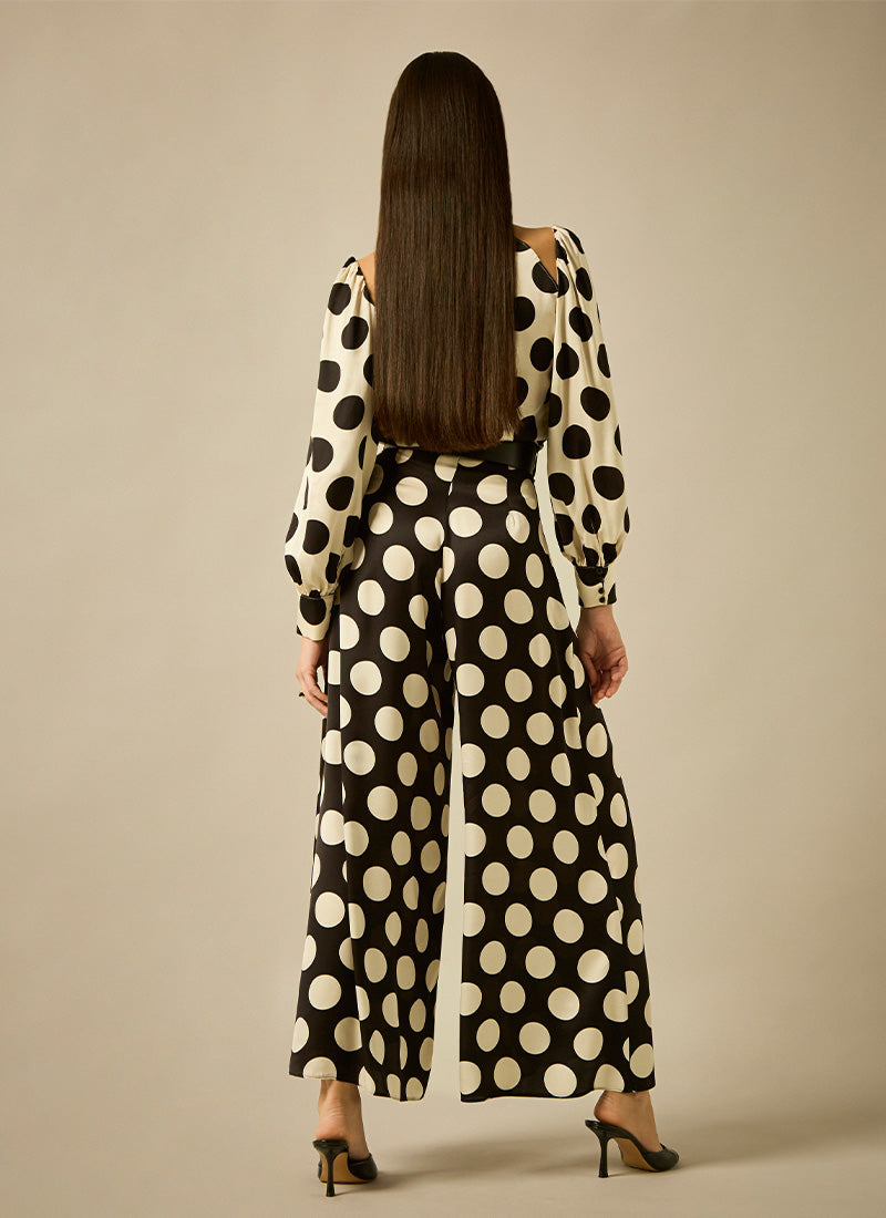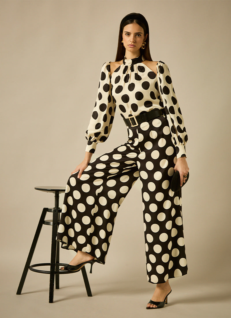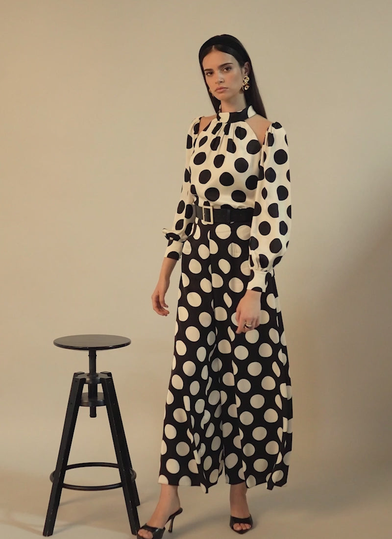 Conjunto estampado de lunares en positivo y negativo, compuesto de una blusa con cuello perkins y transparencias en los hombros, falda-pantalón al tobillo