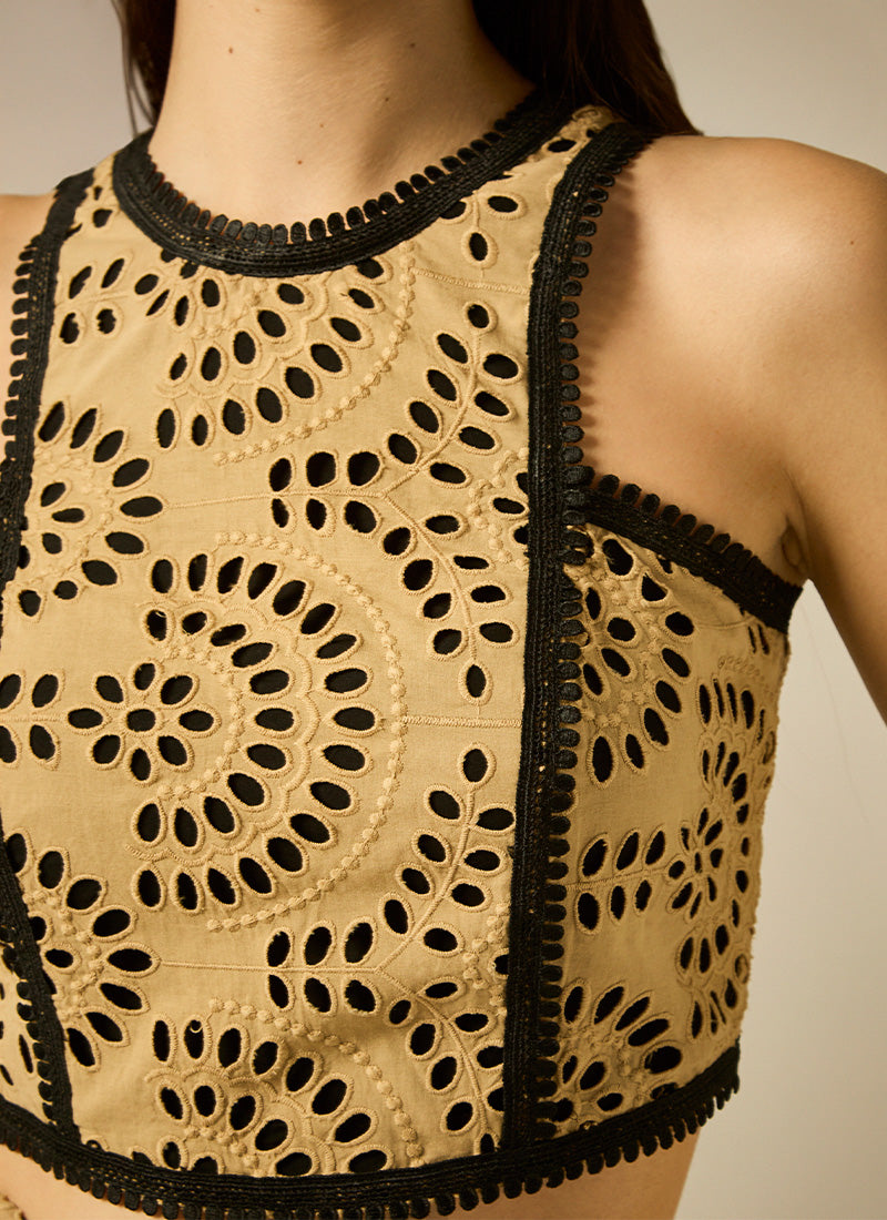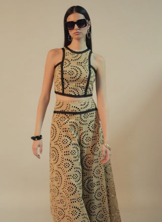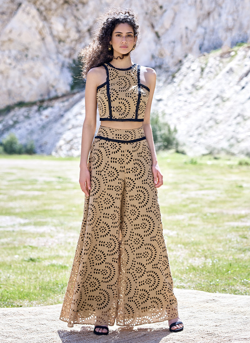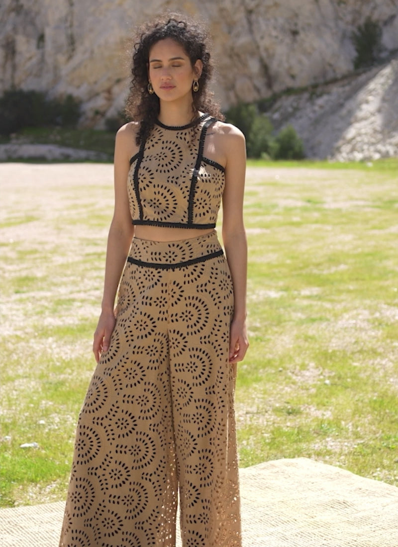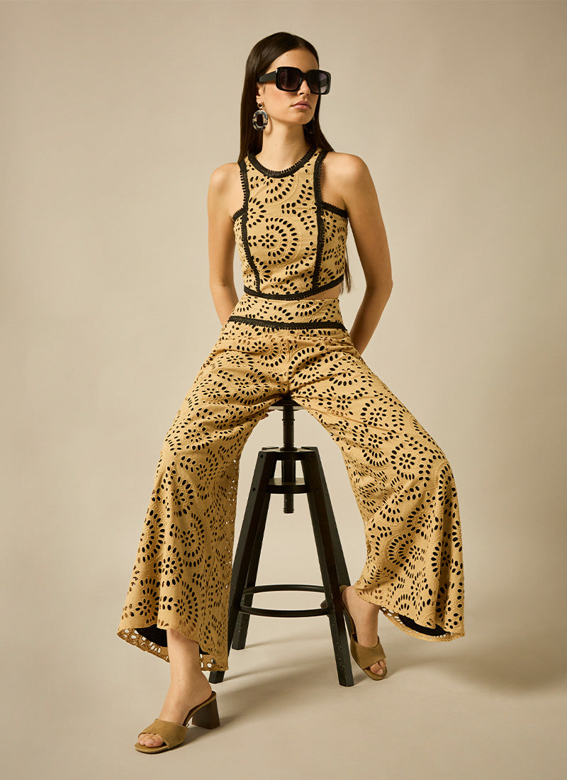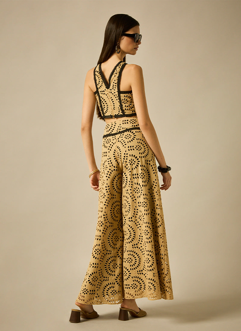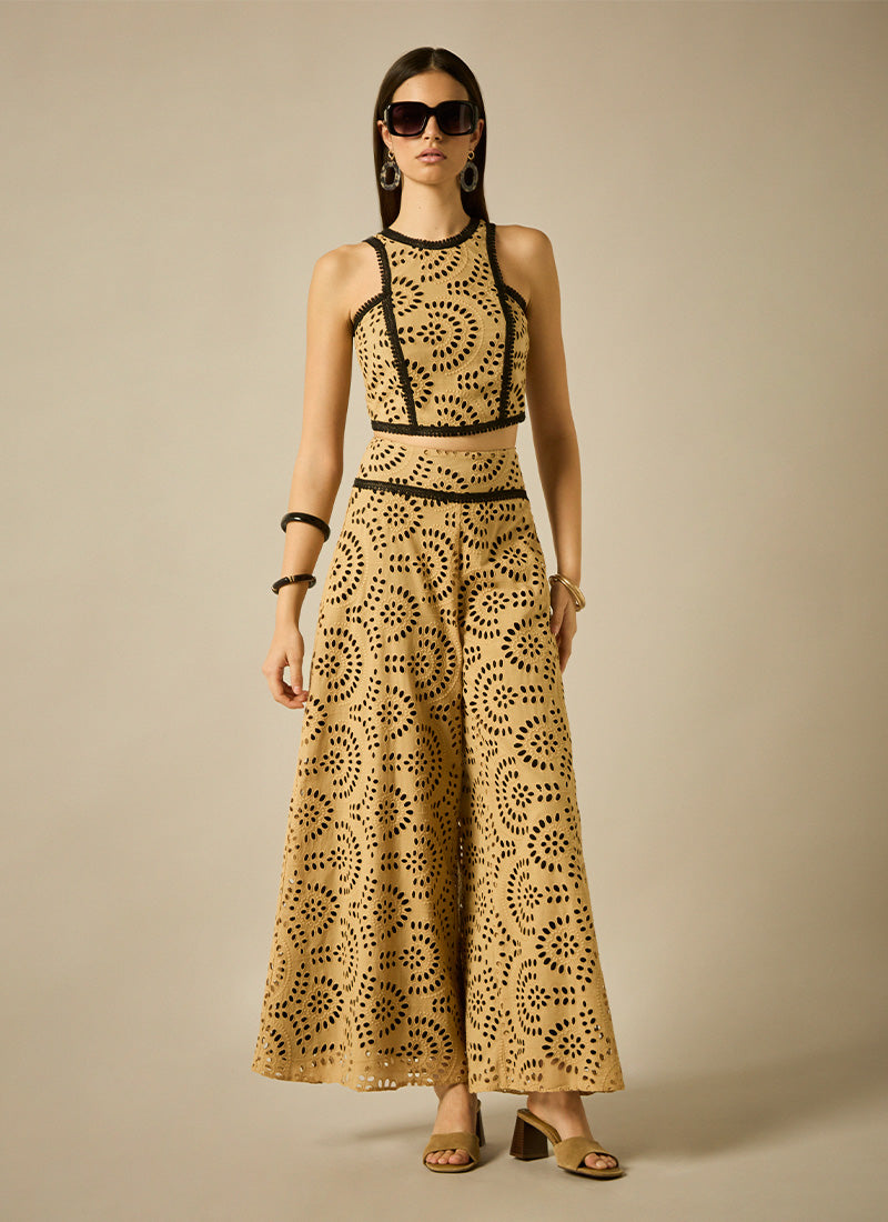 Conjunto de top con escote halter y falda-pantalón ambos confeccionados en bordado perforado y con adornos de pasamanería en contraste