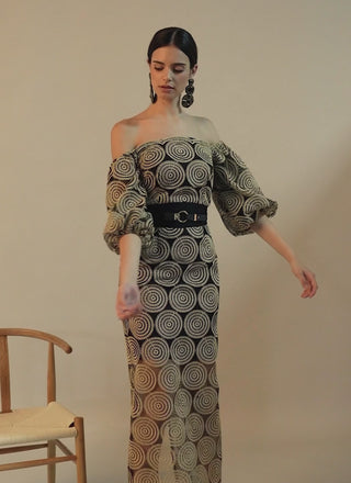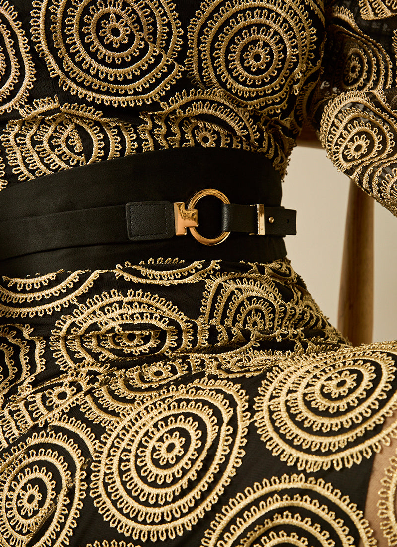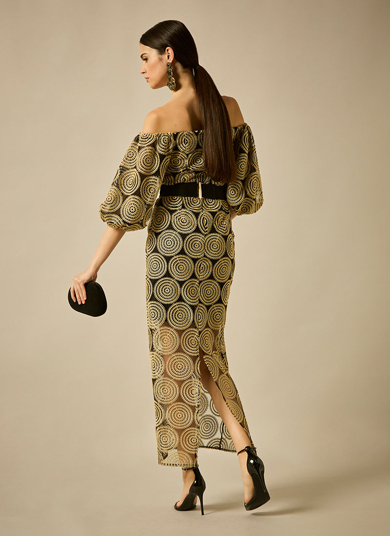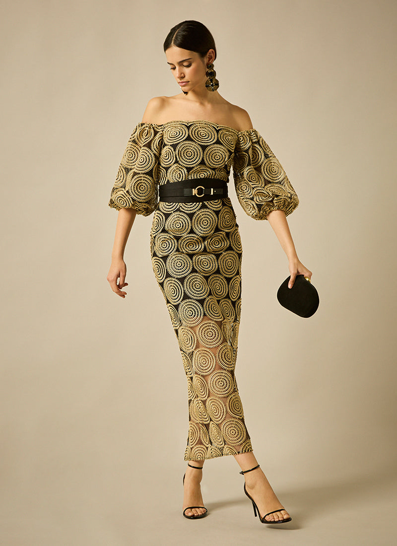 Vestido midi con transparencia en falda confecionado en tull negro bordado en oro , escote Bardot con ondas y manga globo, cintura ajustada por un cinturón negro con hebilla dorada