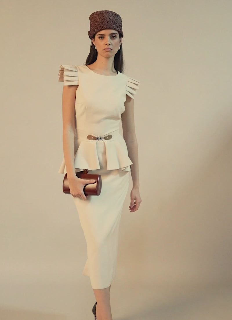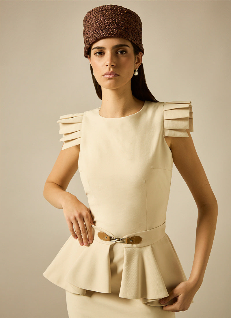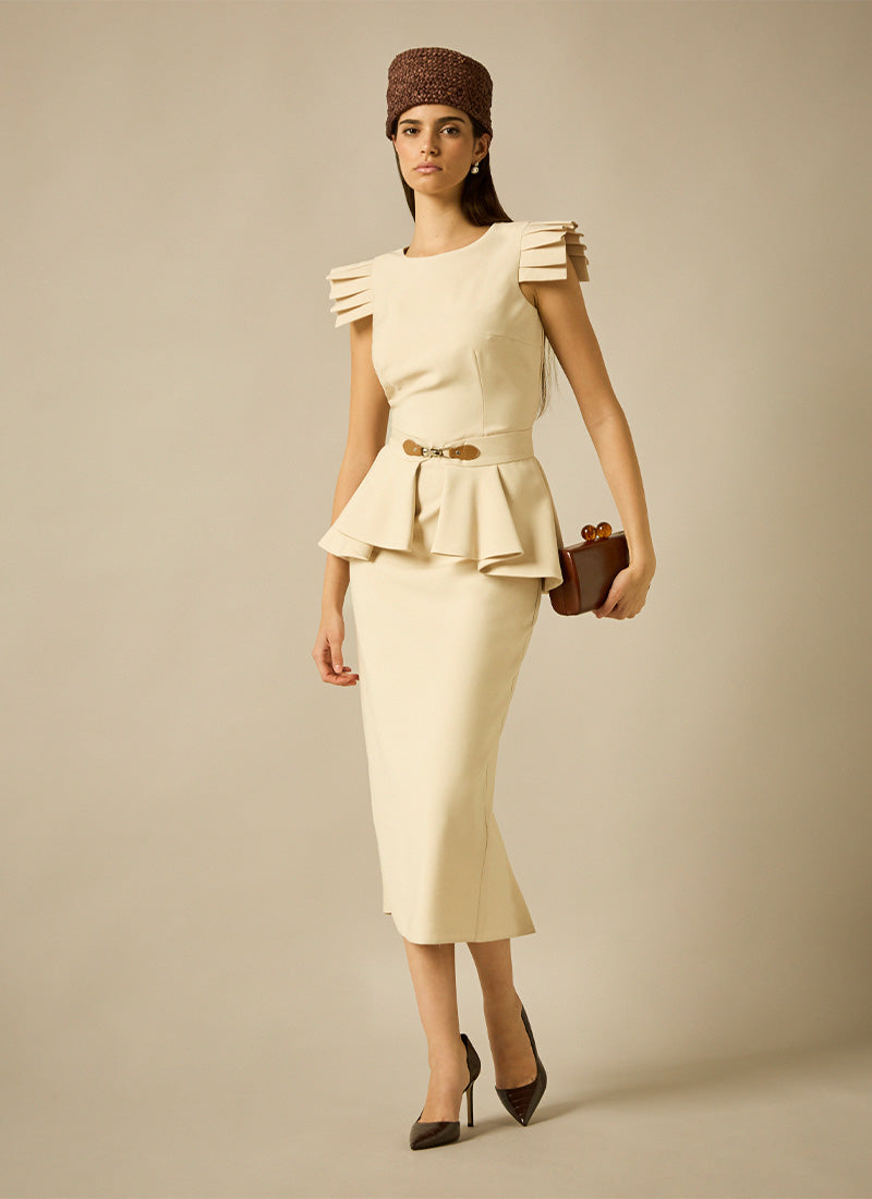 Vestido midi con falda lápiz, escote caja sin mangas y detalle tableado en hombro. Cinturón con peplum tableado adornado con hebilla.