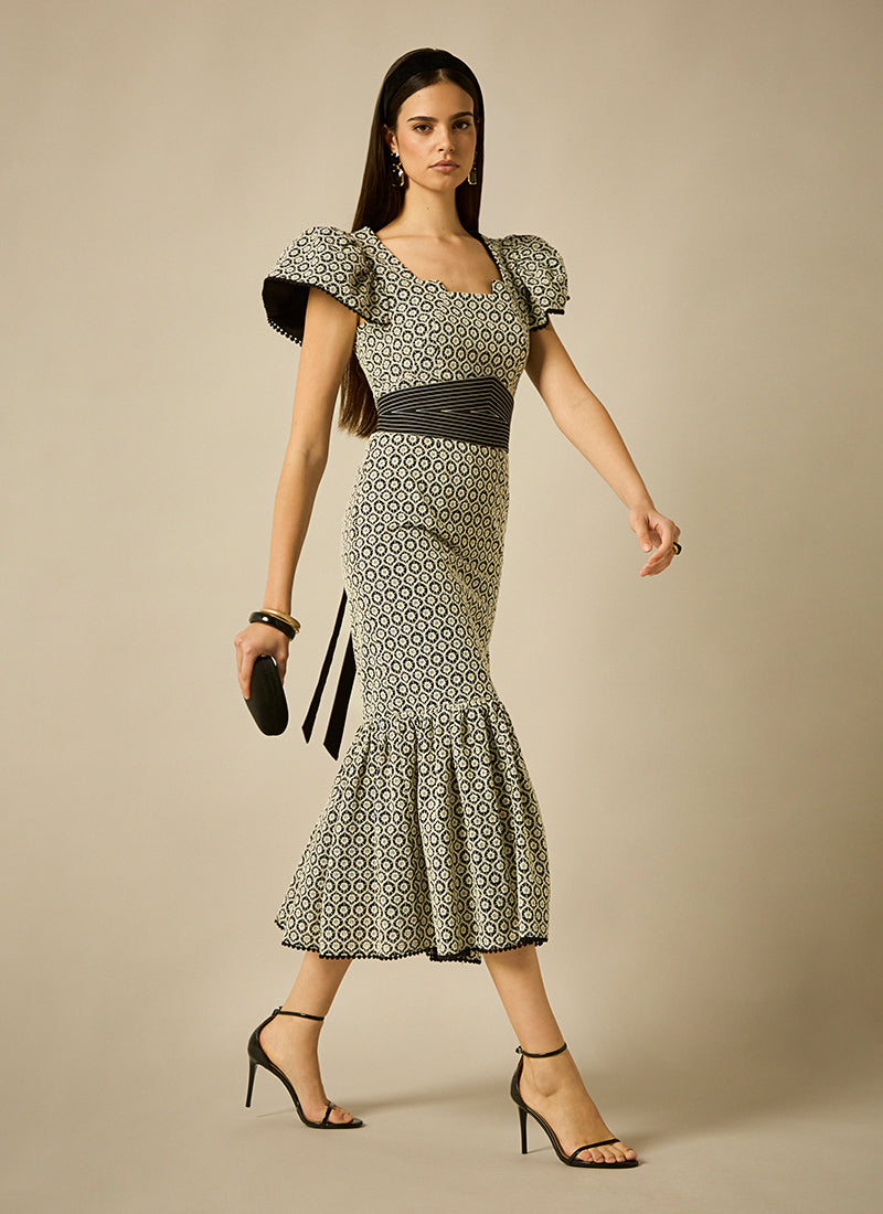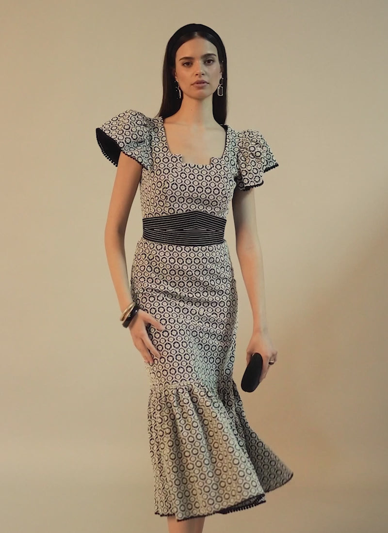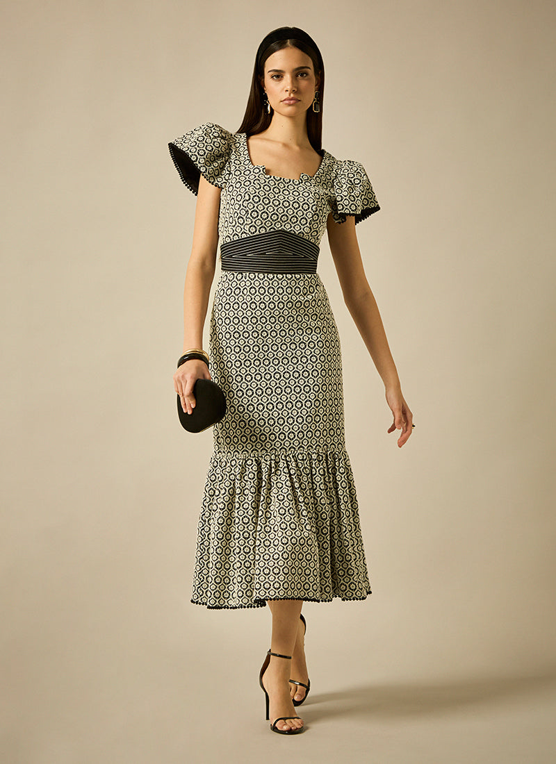 Vestido midi de línea sirena, confeccionado en tejido bordado en contraste, hombros con volante riveteados con pasamanería al igual que el bajo de la falda,y cinturón anudado con pespuntes en contraste