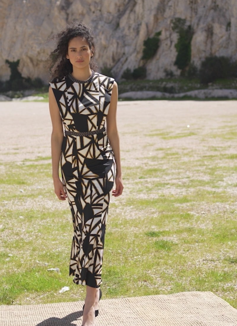 Vestido midi estampado con falda línea sirena y espalda descubierta, pasamanería en cuello y la cintura con solapas en hombros