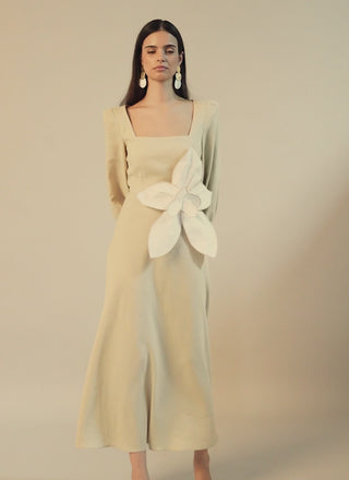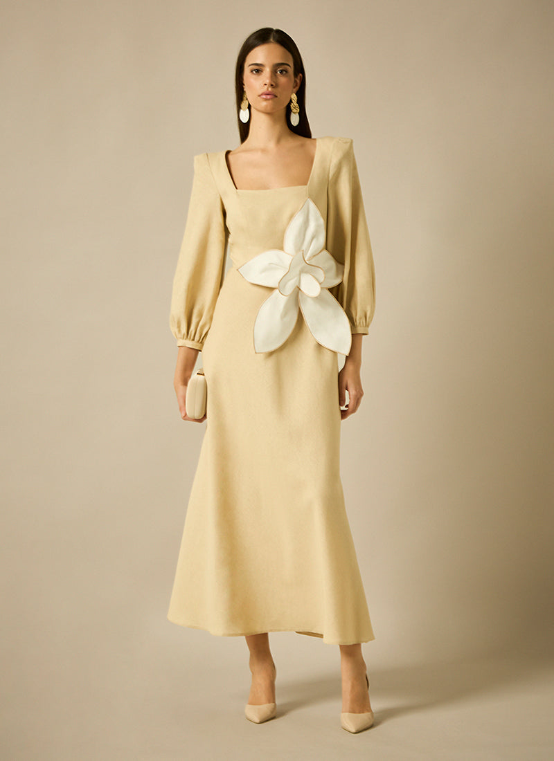 Vestido midi fluido, con escote cuadrado y manga larga amplia, la silueta se realza con un detalle maxi de flor aplicada en la cintura