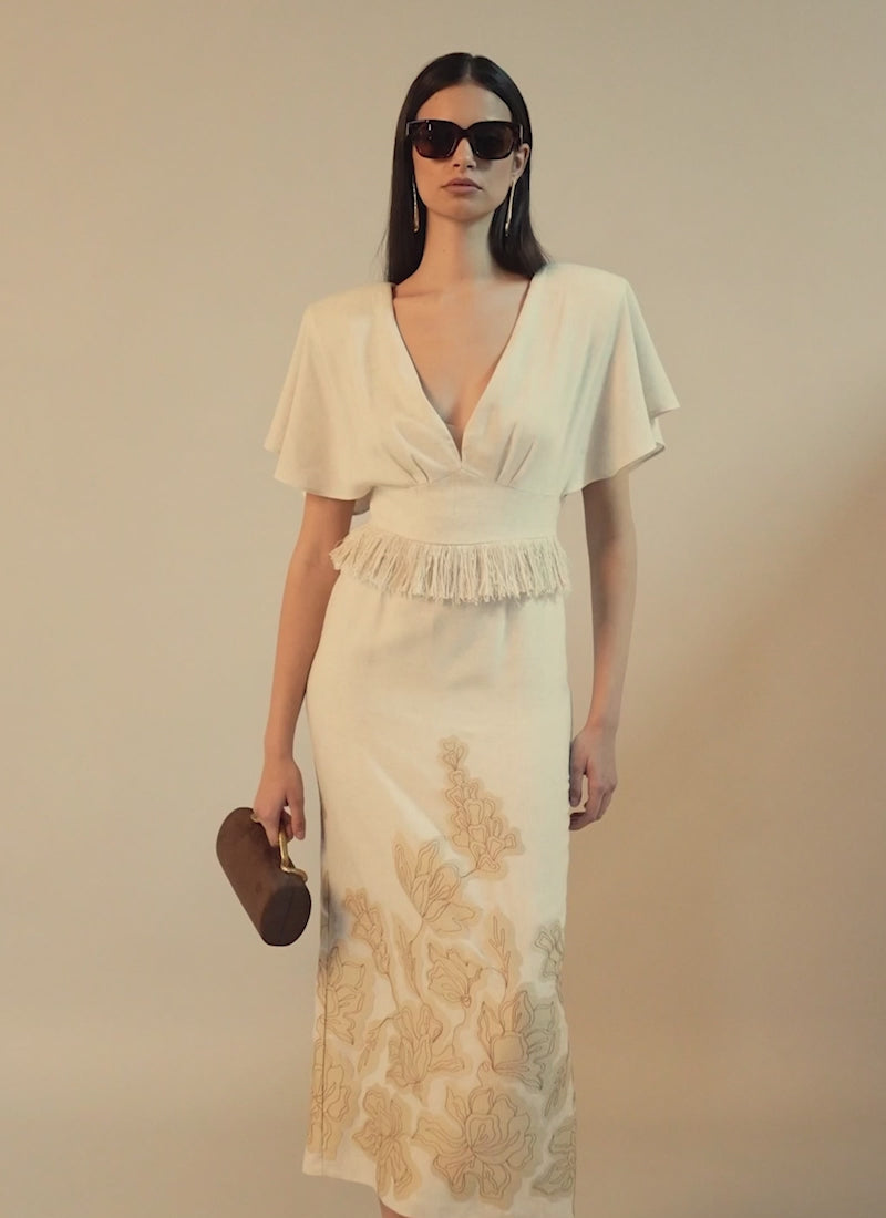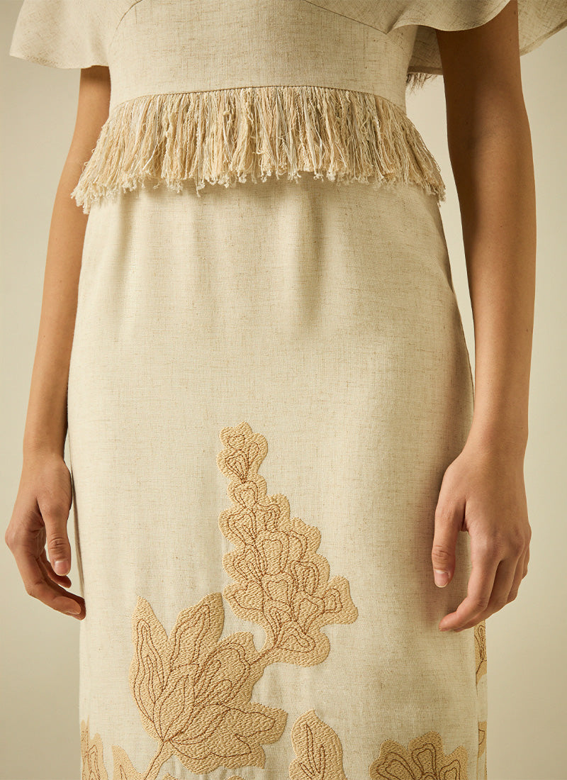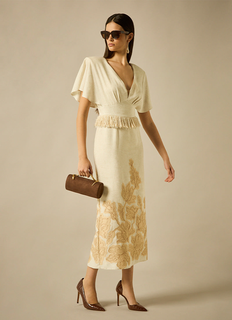 Vestido midi de línea sirena, confeccionado en tejido bordad en contraste, hombros con volante reveteados con pasamanería al igual que el bajo de la falda