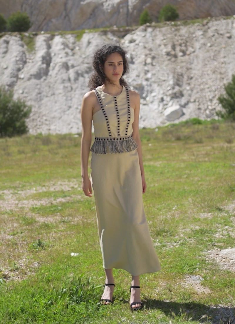 Vestido midi con falda al biés y escote harter, costadillos de espalda descubiertos adornados con pasamanería a juego con las del delantero y los flecos de la cintura