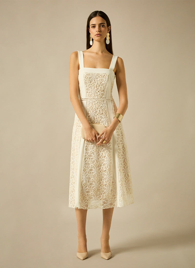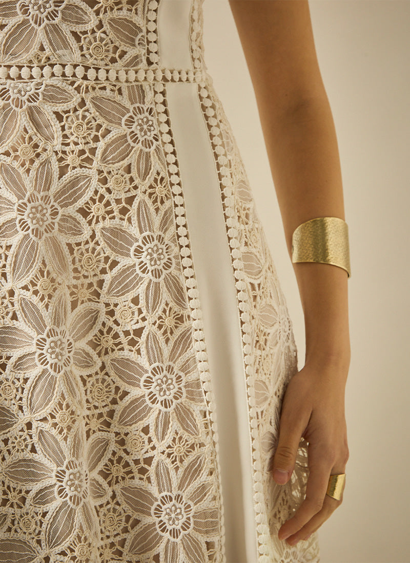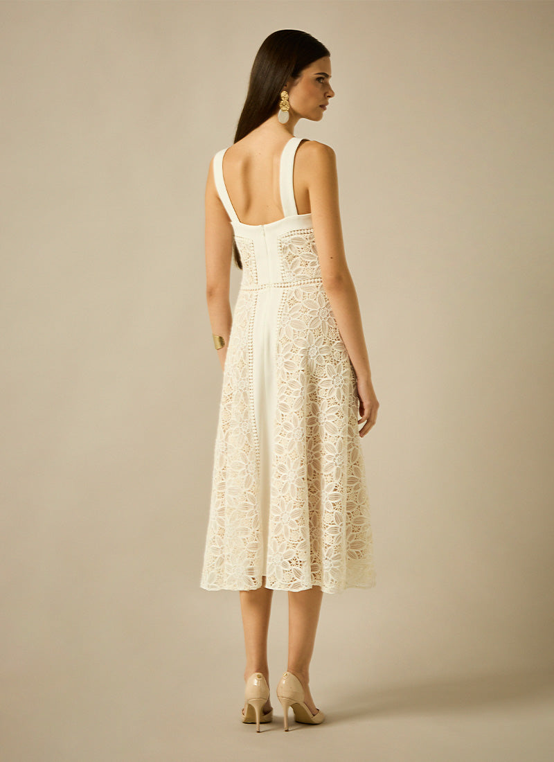 Vestido con largo a media pierna y silueta A, escote cuadrado y tirantes, en el cuerpo se combina el tull bordado con la pasamanería y el liso a juego