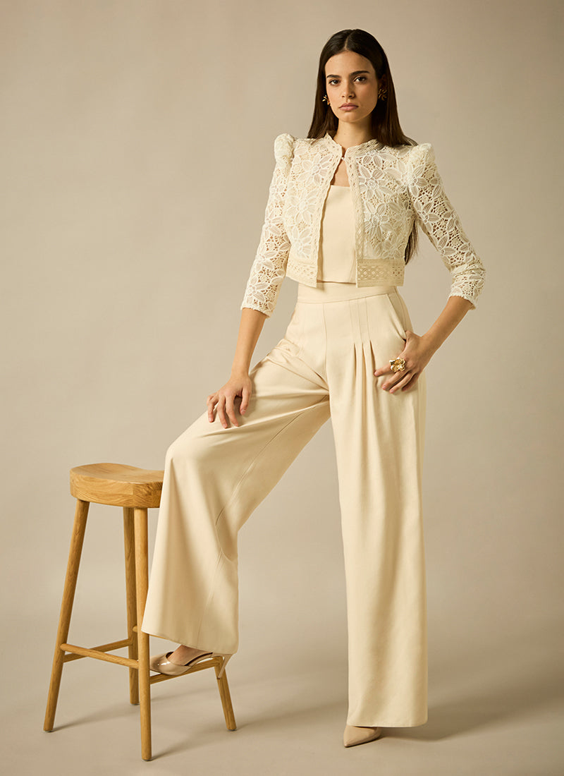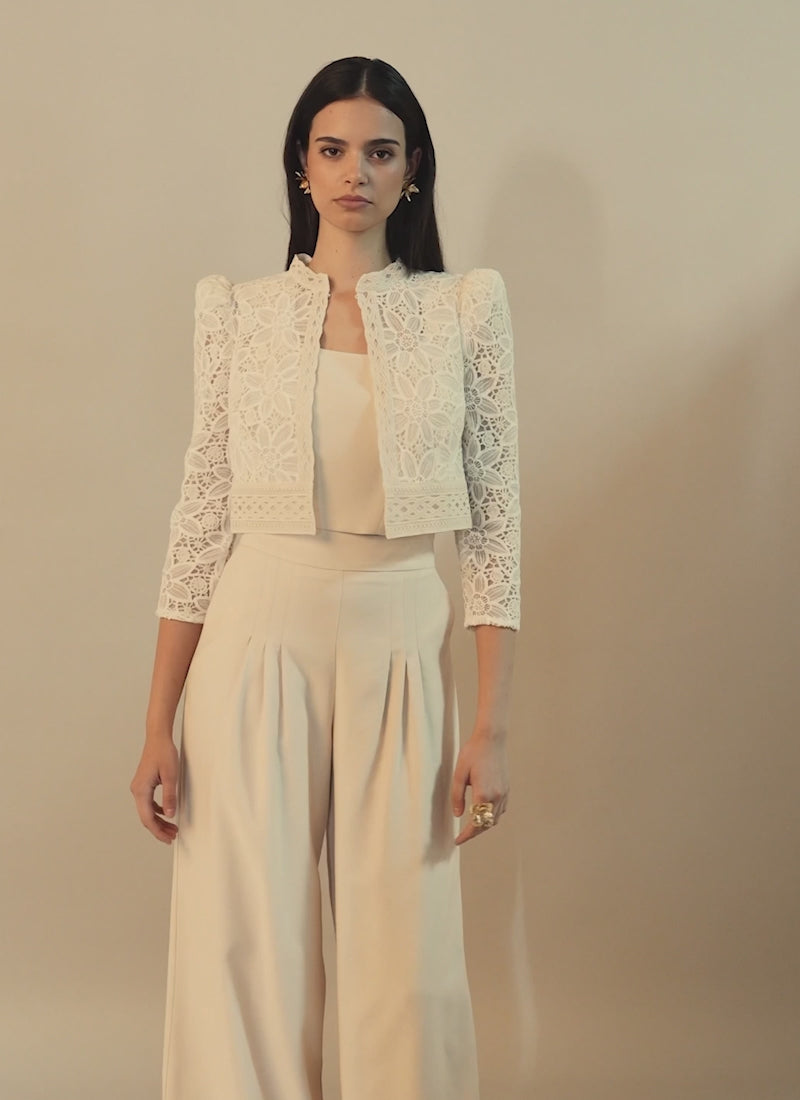 Chaqueta corta confeccionada en tull bordado adornada con guipur